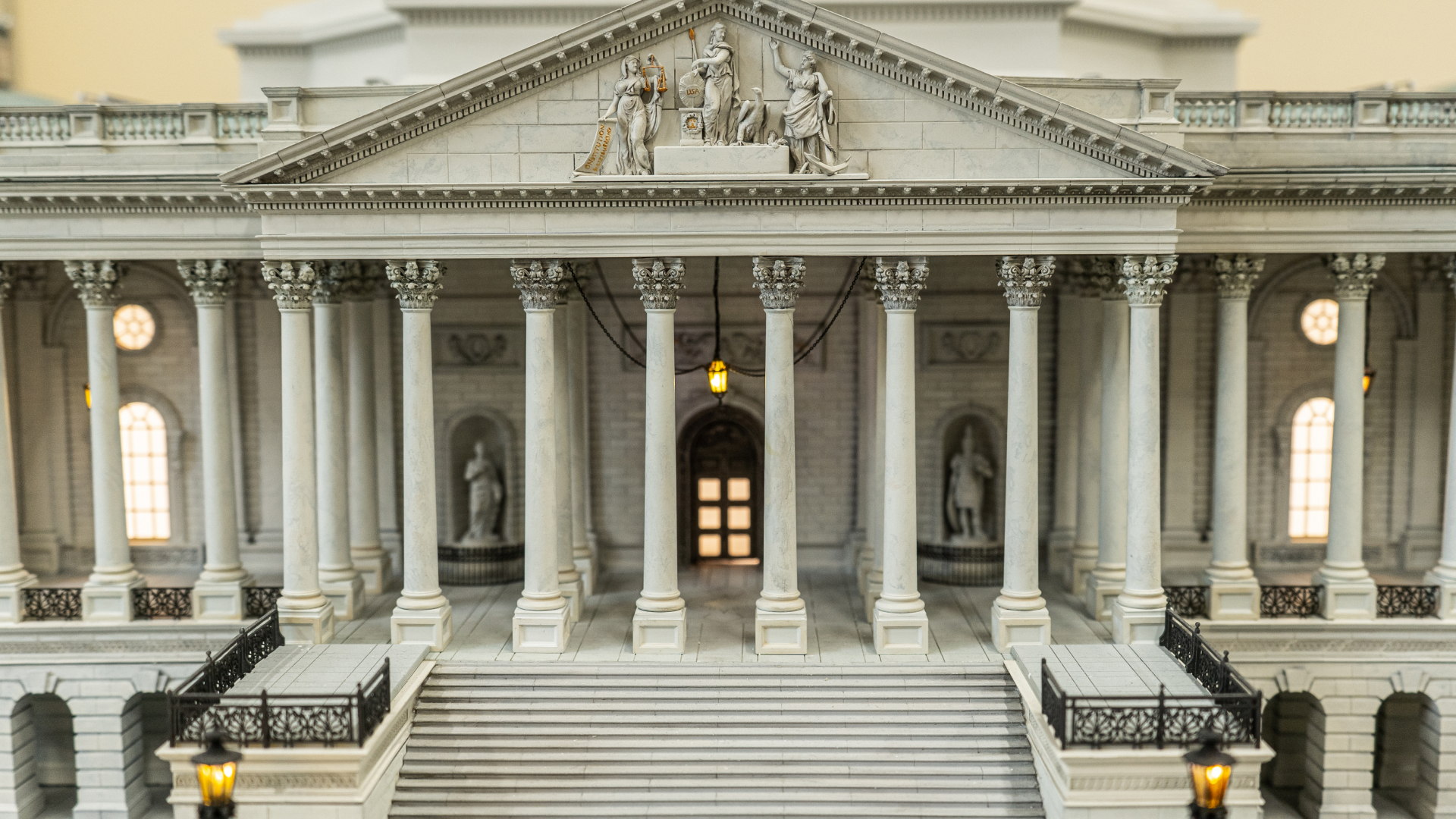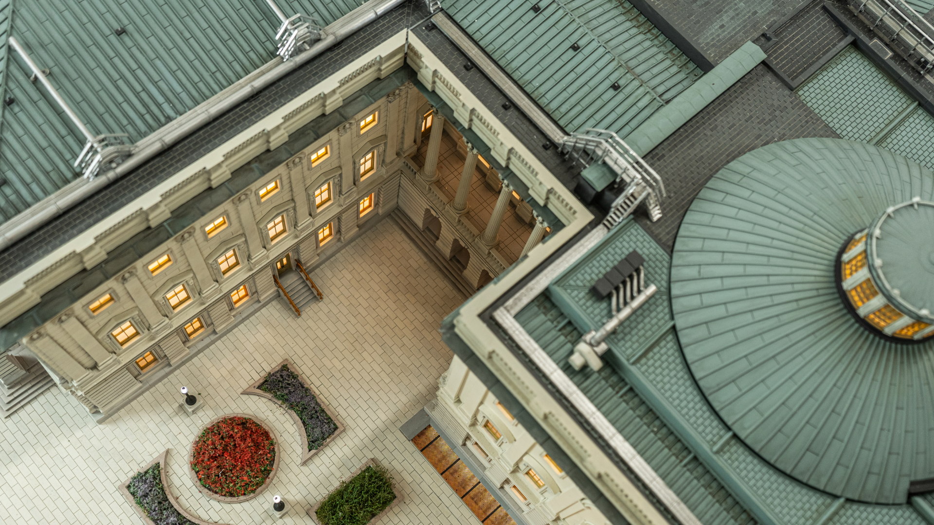 The actual process of building the model took six months of careful work. Simple elements such as walls and roofs were cut from polystyrene on CNC milling machines. The more complex parts — columns, capitals, mouldings, windows and balustrades — were 3D printed in photopolymer resin. Around 70% of all the small parts in the model were made using photopolymer printing.